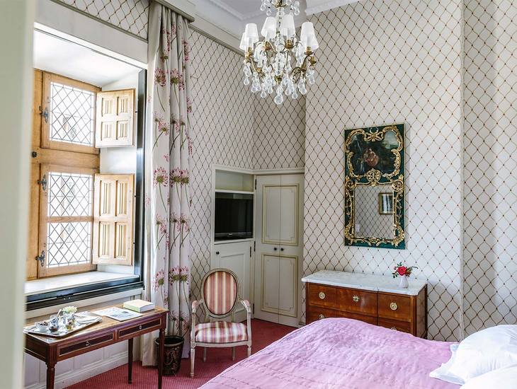 One of many outstanding features to the Junior Suite, exceptional views through the vast, mullioned windows reveal a 350 year old Lebanon Cedar and the Dordogne River. Swirling the room in a quiet and simple gentleness, a reminder of proximity to the great outdoors. Respectfully rooted to its heritage through beautiful Gothic styled furniture, patterns and materials. Each Junior suite holds a king size bed or a four-poster bed and includes a sitting room area. The spacious bathrooms are equipped with a Jacuzzi bath and multi-jet shower. Toiletries included.